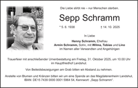 Die Liebe stirbt nie - nur Menschen sterben. Sepp Schramm * 5. 6. 1938 + 14. 10. 2025 In Liebe Henny Schramm, Ehefrau Armin Schramm, Sohn, mit Wilma, Tobias und Lino im Namen aller Verwandten und Angehörigen Trauerfeier mit anschließender Urnenbestattung am Freitag, 31. Oktober 2025, um 10.00 Uhr im Hauptfriedhof Landshut. Von Beileidsbezeigungen am Grab bitten wir Abstand zu nehmen. Anstelle von Blumen und Kränzen bitten wir um eine Spende an das Magdalenenheim Landshut, IBAN: DE***, Kennwort: 'Sepp Schramm'.