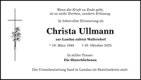 Wenn die Kraft zu Ende geht, ist es nicht Sterben, sondern Erlösung. In liebevoller Erinnerung an Christa Ullmann aus Landau zuletzt Wallersdorf * 19. März 1948 _ 30. Oktober 2025 In stiller Trauer: Die Hinterbliebenen Die Urnenbestattung fand in Landau im Familienkreis statt.