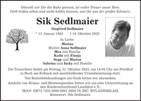 Obwohl wir Dir die Ruhe gönnen, ist voller Trauer unser Herz. Dich leiden sehen und nicht helfen können, war für uns der größte Schmerz. Sik Sedlmaier Siegfried Sedlmaier * 11. Januar 1962 + 14. Oktober 2025 In Liebe: Marina Mutter Anna Sedlmaier Max mit Familie Kathi mit Finnja Sepp und Marion Sabrina und Jacky mit Familie Die Trauerfeier findet am Freitag, 31. Oktober 2025, um 14.00 Uhr am Friedhof in Buch am Erlbach mit anschließender Urnenbeisetzung statt. Von Beileidsbekundungen am Grab bitten wir abzusehen. Anstelle von Kranz- und Blumenspenden bitten wir um eine Unterstützung an den Kinderschutzbund Landshut e. V.: IBAN: DE***, BIC: BYLADEMILAH, Kennwort: Sik Sedlmaier.