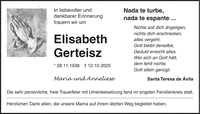 Nada te turbe, nada te espante ... Nichts soll dich ängstigen, nichts dich erschrecken, alles vergeht. Gott bleibt derselbe, Geduld erreicht alles. Wer sich an Gott hält, dem fehlt nichts. Gott allein genügt. Santa Teresa de ÁvilaIn liebevoller und dankbarer Erinnerung trauern wir um Elisabeth Gerteisz * 28.11.1938 + 12.10. 2025 Maria und Anneliese Die sehr persönliche, freie Trauerfeier mit Umenbeisetzung fand im engsten Familienkreis statt. Herzlichen Dank allen, die unsere Mama auf ihrem letzten Weg begleitet haben.