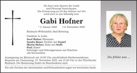 Du hast viele Spuren der Liebe und Fürsorge hinterlassen. Die Erinnerung an all das Schöne mit Dir wird stets in uns lebendig sein. Gabi Hofner * 3. Januar 1958 + 6. November 2025 Rimbach-Wöhrmühle, Bad Kötzting Dankbar in Liebe Josef Hofner, Ehemann Sandra Bauer, Tochter mit Daniel Martin Hofner, Sohn mit Steffi Paul, Enkel Schwäger und Schwägerinnen mit Familien alle Verwandten Aussegnung am Mittwoch um 18.00 Uhr, anschließend Sterberosenkranz. Requiem am Donnerstag, 13. November 2025, um 15.00 Uhr in der Pfarrkirche Rimbach. Die Beisetzung findet im Familienkreis statt. Für alle Zeichen der Anteilnahme und Verbundenheit sagen wir herzlichen Dank.Du fehlst uns ...