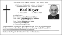 Seine Kräfte waren zu Ende, nimm ihn, o Herr, in deine Hände. In Liebe und Dankbarkeit nehmen wir Abschied von meinem Vater, Opa, Uropa und Bruder Karl Mayer * 18. Januar 1943 _ 16. Februar 2026 In stiller Trauer: Deine Tochter Andrea Weber mit Richard Deine Enkel: Franziska Angstl mit Andreas, Stefan und Andreas Deine Urenkel: Johannes und Anna Dein Bruder Eduard Mayer im Namen aller Angehörigen Aussegnung heute, Donnerstag, den 19. Februar 2026, um 16.00 Uhr, anschließend Sterberosenkranz in Unholzing. Gottesdienst am Samstag, den 21. Februar 2026, um 10.00 Uhr, anschließend Beerdigung in Unholzing. Ein herzliches Vergelt's Gott für alle Zeichen der Anteilnahme.