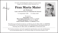 In Liebe und Dankbarkeit nehmen wir nach einem langen und erfüllten Leben Abschied von Frau Maria Maier geb. Thalhammer Land- und Gastwirtin aus Neukirchen bei Arnstorf * 14. September 1929 + 18. März 2026 Es trauern: Franz Maier, Sohn Maria Angela Salzberger, Tochter mit Josef Gabriele Bachmeier, Tochter mit Horst Armin, Daniela, Simone und Johanna, Enkel Überführung mit Sterberosenkranz am Montag, den 23. März 2026, um 18.00 Uhr in Neukirchen. Der Trauergottesdienst mit anschließender Beerdigung findet am Dienstag, den 24. März 2026, um 10.00 Uhr in Neukirchen statt. Für bereits erwiesene und noch zugedachte Anteilnahme sowie für die Teilnahme an der Beerdigung sagen wir auf diesem Wege ein herzliches Vergelt's Gott.