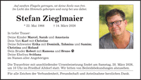 Auf sanften Flügeln getragen, ist deine Seele nun frei. Im Licht des Himmels geborgen und ewig bei uns dabei. Stefan Zieglmaier * 22. Mai 1966 _ 14. März 2026 In tiefer Trauer: Deine Kinder Marcel, Sarah und Anastasia Dein Vati Karl mit Christine Deine Schwester Erika mit Dominik, Tahmina und Samim; Christina und Roland Dein Bruder Robert mit Ramona und Bruno Deine Ehefrau Svitlana im Namen aller Angehörigen Die Trauerfeier mit anschließender Urnenbeisetzung findet am Samstag, 28. März 2026, um 10 Uhr im Friedhof Altdorf statt. Wir bitten von Beileidsbekundungen abzusehen. Für alle Zeichen der Verbundenheit, Freundschaft und Anteilnahme herzlichen Dank.