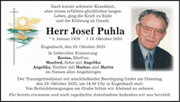 Nach kurzer schwerer Krankheit, aber einem erfüllten glücklichen langen Leben, ging die Kraft zu Ende und die Erlösung ist Gnade. Herr Josef Puhla * 5. Januar 1929 + 18. Oktober 2025 Eugenbach, den 25. Oktober 2025 In liebevoller Erinnerung: Rosina, Ehefrau Manfred, Sohn mit Angelika Angelika, Tochter mit Markus und Martin im Namen aller Angehörigen Der Trauergottesdienst mit anschließender Beerdigung findet am Dienstag, den 28. Oktober 2025, um 14.00 Uhr in Eugenbach statt. Von Beileidsbezeigungen am Grabe bitten wir Abstand zu nehmen. Für bereits erwiesene und noch zugedachte Anteilnahme bedanken wir uns herzlich.